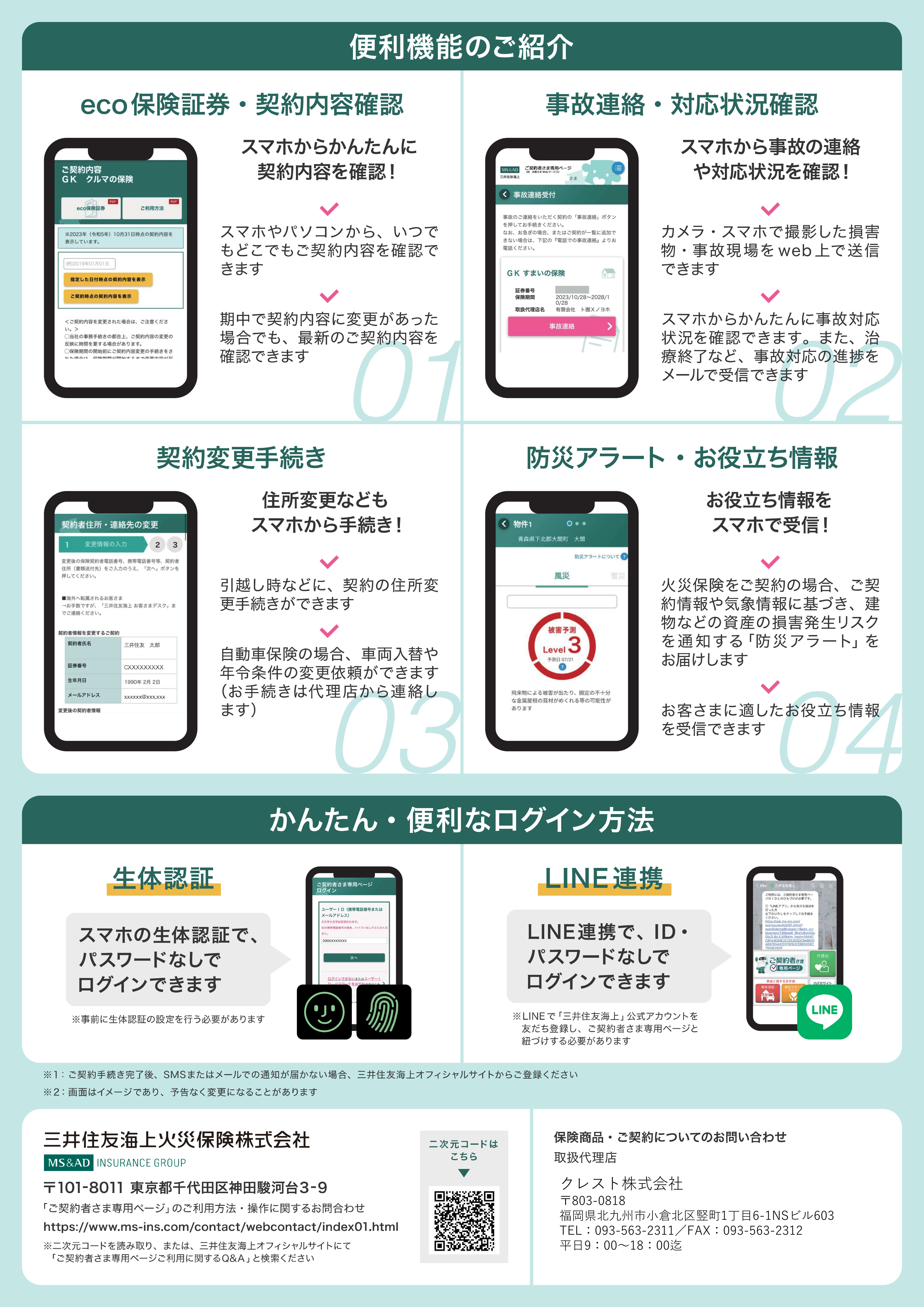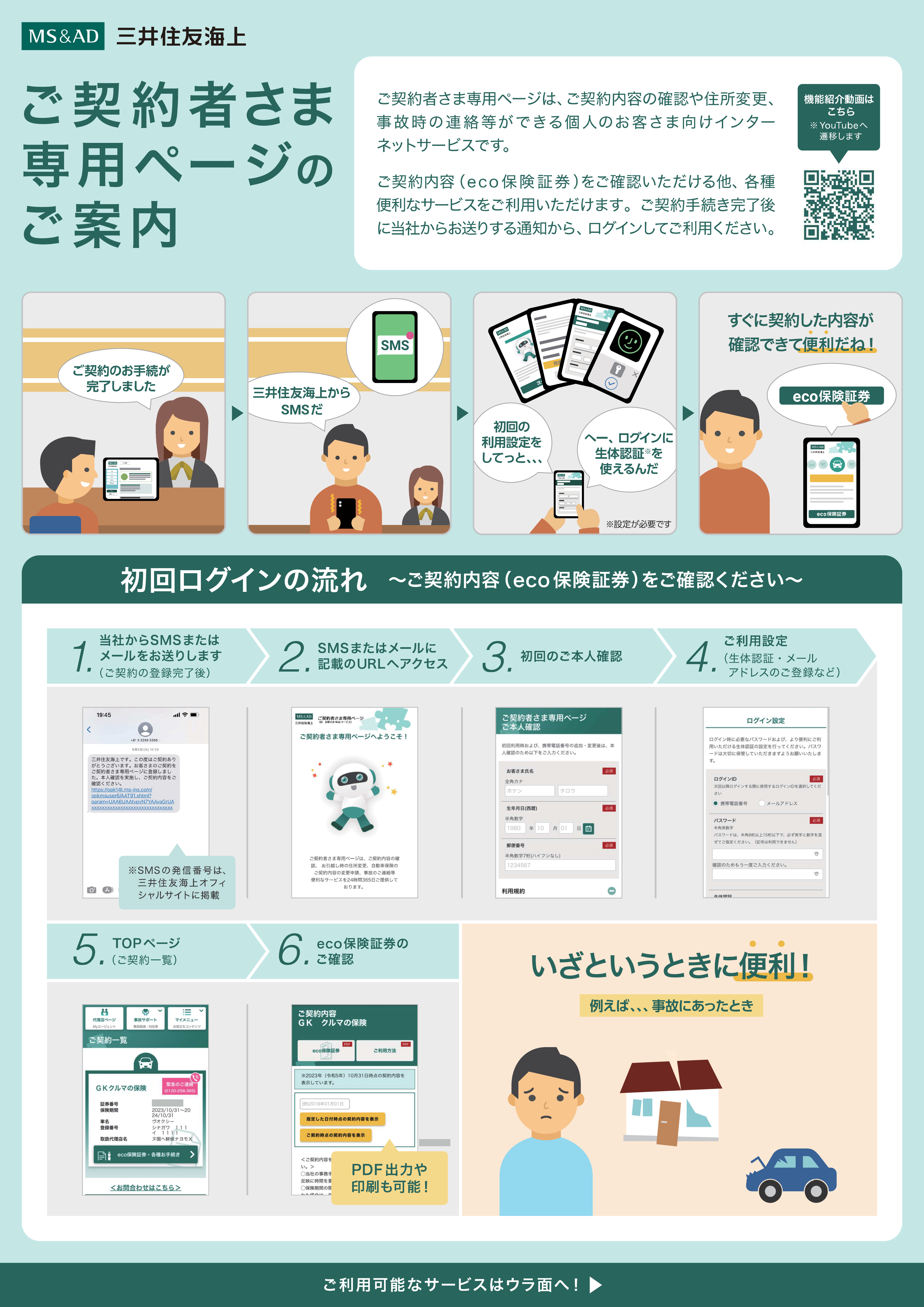 自動車事故・自然災害による事故などの事故受付やご契約内容の確認、住所変更、保険料控除証明書の再発行、自動車事故の事故対応状況の確認など様々な機能を備えております。スマートフォン1つで24時間365日ご確認いただけます。