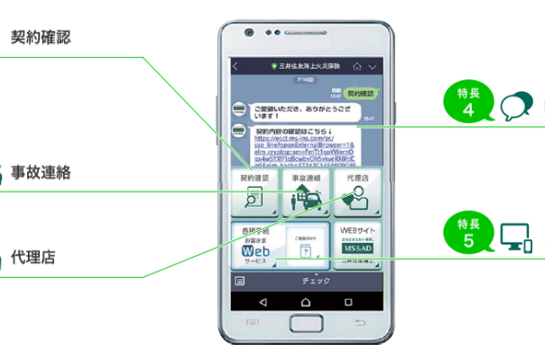 自動車事故・自然災害による事故などの事故受付やご契約内容の確認、住所変更、保険料控除証明書の再発行、自動車事故の事故対応状況の確認など様々な機能を備えております。スマートフォン1つで24時間365日ご確認いただけます。